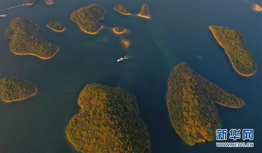 11月9日無人機拍攝的廬山西海。 當(dāng)日,落日余暉下的江西廬山西海山青水藍(lán),美不勝收。 新華社記者 周密 攝