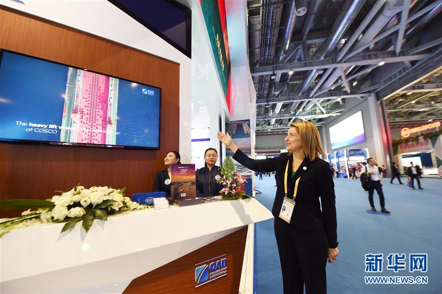 這是在第二屆進(jìn)博會上拍攝的希臘比雷埃夫斯港展臺(11月8日攝)。新華社記者尹炣攝
