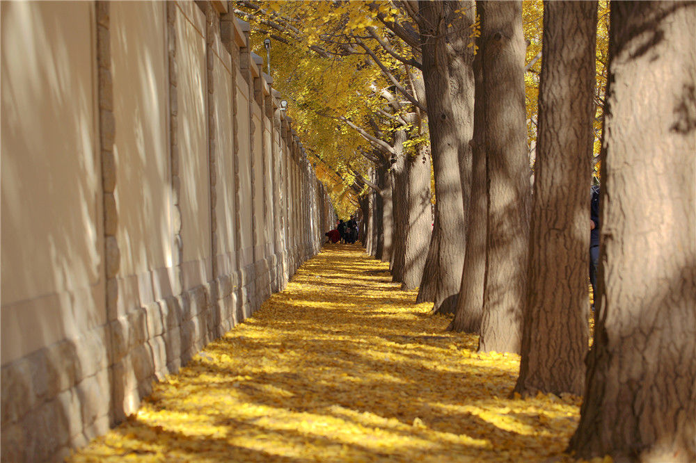2019年11月11日,北京,西城區(qū)三里河數(shù)百米銀杏大道一片金黃,吸引眾多游人欣賞拍照。