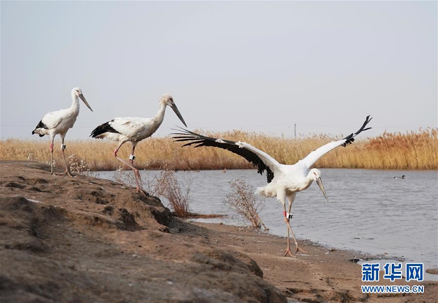 這是在樂亭縣野生動物保護協(xié)會大清河鳥類救助站放飛回歸大自然的三只國家一級保護動物東方白鸛(11月16日攝)。新華社記者楊世堯攝