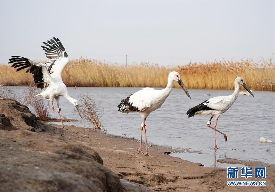 這是在樂亭縣野生動(dòng)物保護(hù)協(xié)會(huì)大清河鳥類救助站放飛回歸大自然的三只國(guó)家一級(jí)保護(hù)動(dòng)物東方白鸛(11月16日攝)。新華社記者楊世堯攝