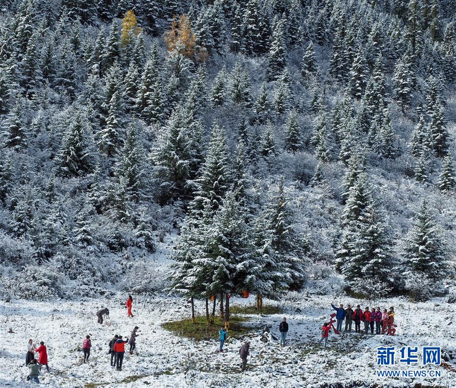 10月17日,在川藏線高爾寺山至理塘路段,部分游客在一個(gè)路邊觀景臺附近拍照留念。當(dāng)日,一場夜雪后,川藏線高爾寺山至理塘路段披上了一層銀裝。雪山、牦牛、云朵、松林,帶來了濃濃的雪域風(fēng)情。新華社記者王迪攝