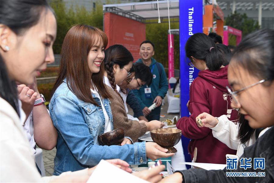 11月17日,來自泰國(guó)的留學(xué)生(左二)在國(guó)際文化節(jié)上將美食給觀眾品嘗。新華社記者 張端 攝