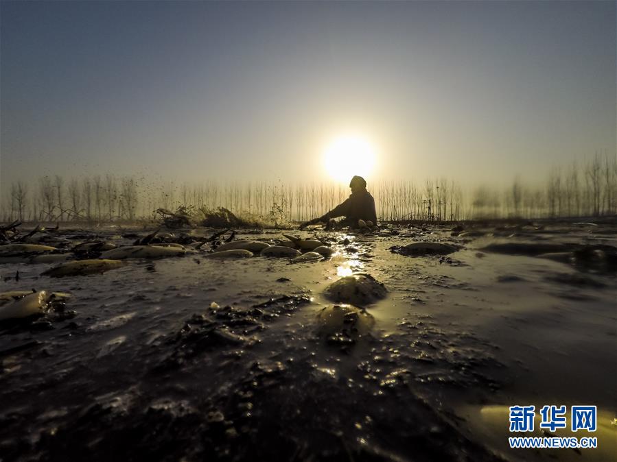 11月18日,工人在采收蓮藕。初冬時節(jié),河北省唐山市曹妃甸蓮藕豐收,工人們在結(jié)冰之前忙著采收蓮藕。新華社記者邢廣利攝