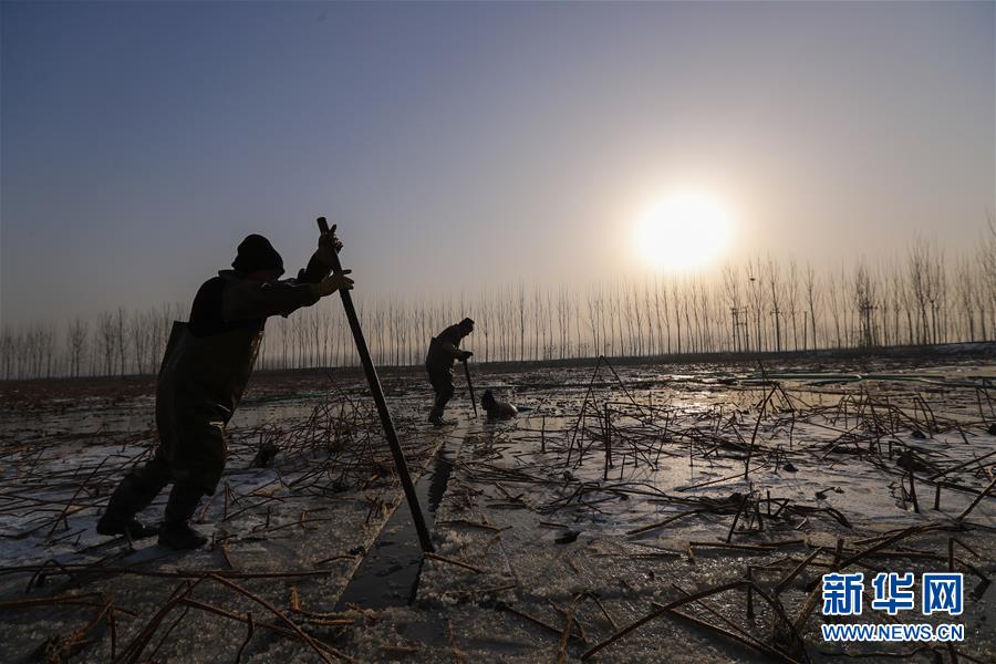 11月18日,工人在采收蓮藕。初冬時節(jié),河北省唐山市曹妃甸蓮藕豐收,工人們在結(jié)冰之前忙著采收蓮藕。新華社記者楊世堯攝