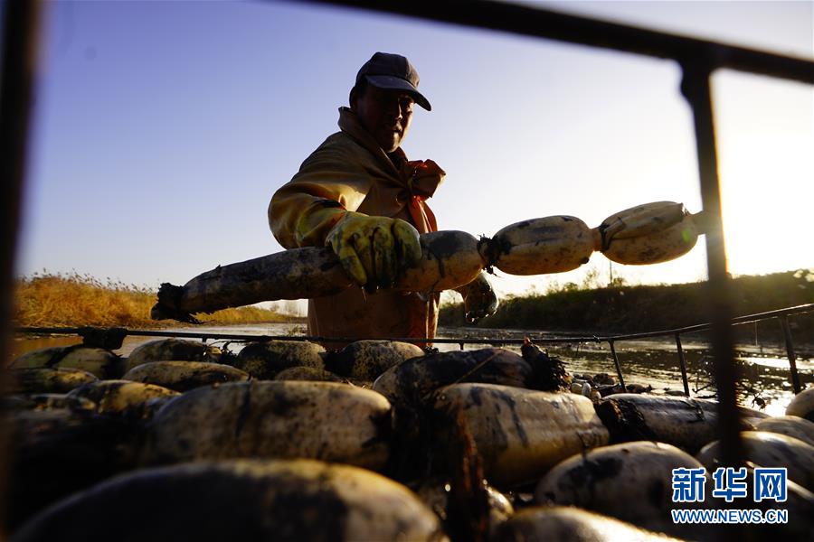 11月18日,工人在采收蓮藕。初冬時(shí)節(jié),河北省唐山市曹妃甸蓮藕豐收,工人們?cè)诮Y(jié)冰之前忙著采收蓮藕。新華社記者邢廣利攝
