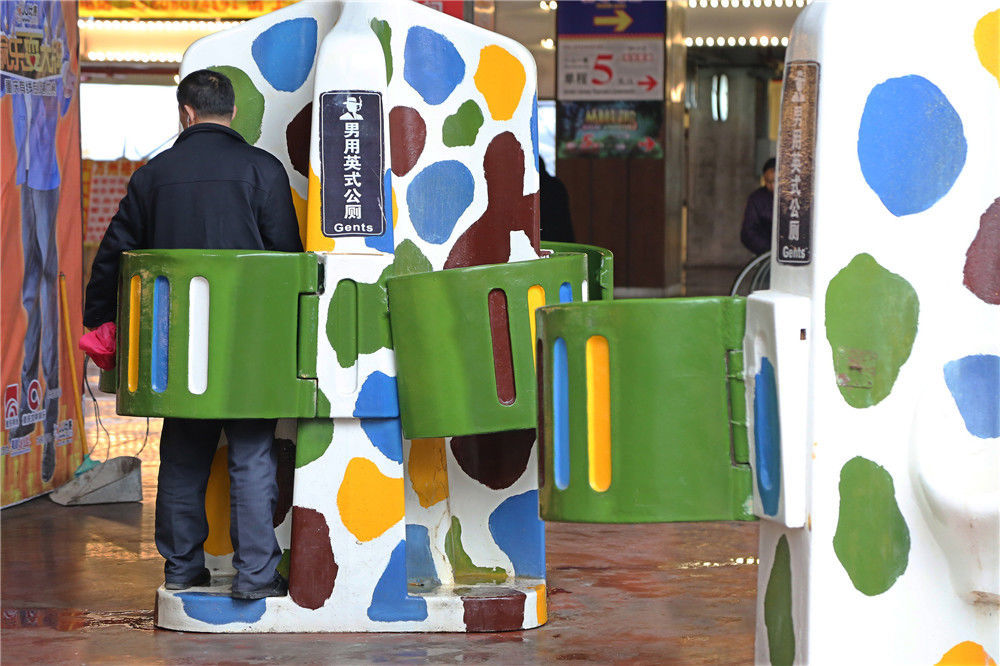 2017年3月15日,重慶,幾座“男用英式公廁”亮相洋人街景區(qū)路邊。這些供男士小便專用的露天公廁,每座有4個站位,仿造英式廁所建造,四面透風(fēng),只遮擋住腰部的部分。左冬辰/視覺中國