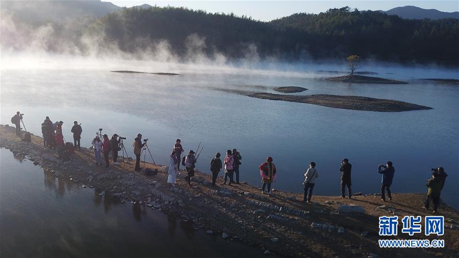 這是11月14日無(wú)人機(jī)拍攝的安徽黟縣奇墅湖晨景。新華社記者張端攝