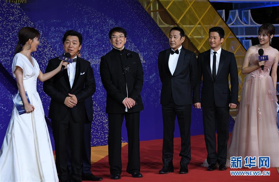 11月23日,黃渤、成龍、陳道明、吳京(左二起)在紅毯儀式上。當(dāng)日,第28屆中國金雞百花電影節(jié)紅毯儀式在福建廈門舉行。新華社記者張國俊攝