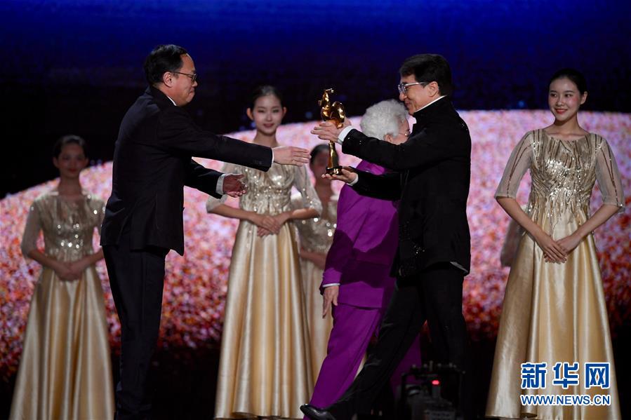 11月23日,電影《流浪地球》獲得最佳故事片獎(jiǎng),成龍?jiān)跒殡娪俺銎贩酱眍C獎(jiǎng)。當(dāng)日,第32屆中國(guó)電影金雞獎(jiǎng)?lì)C獎(jiǎng)典禮在福建廈門舉行。新華社記者姜克紅攝