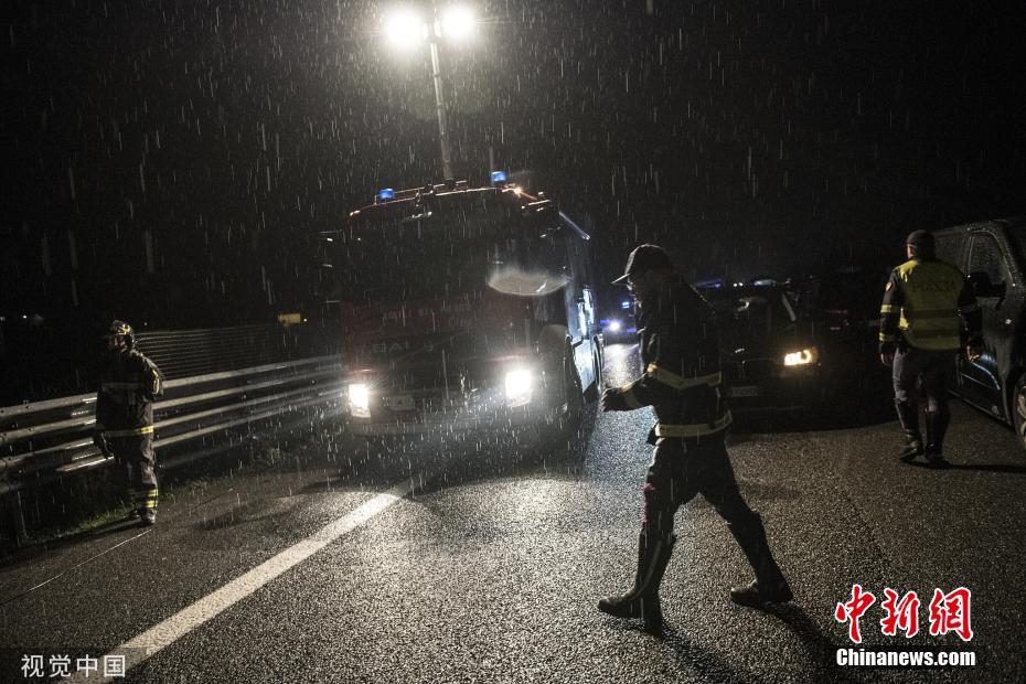 當(dāng)?shù)貢r(shí)間2019年11月24日,意大利Villafranca dAsti,意大利遭受惡劣天氣和持續(xù)多日的暴雨,通往都靈方向的A21高速公路路面出現(xiàn)“大坑”。圖片來源:視覺中國