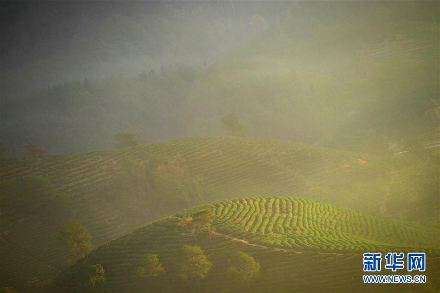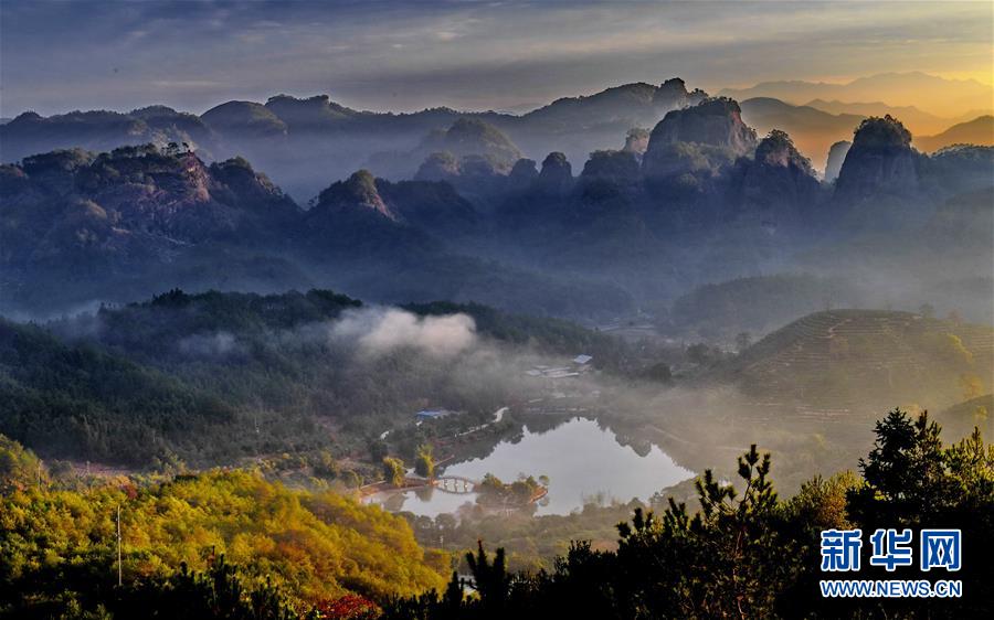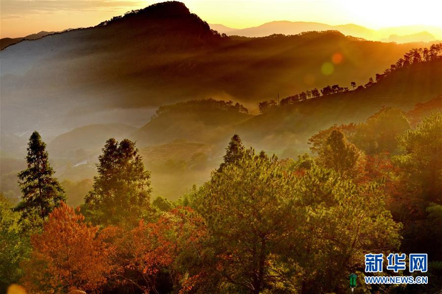 福建省武夷山的茶山云霧繚繞,在朝陽照射下如夢如幻(11月17日攝)。新華社記者宋為偉攝