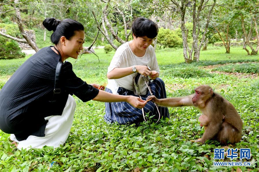 游客在武夷山自然保護(hù)區(qū)喂猴(7月20日攝)。新華社記者張國俊攝