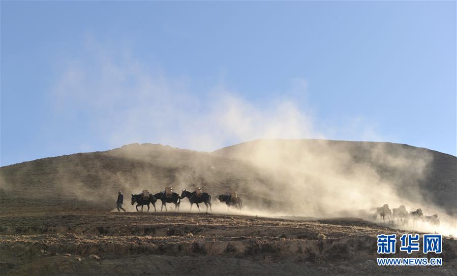 12月6日,騾馬隊馱負工程物料前往山頂塔基施工現(xiàn)場。新華社記者侯捷攝
