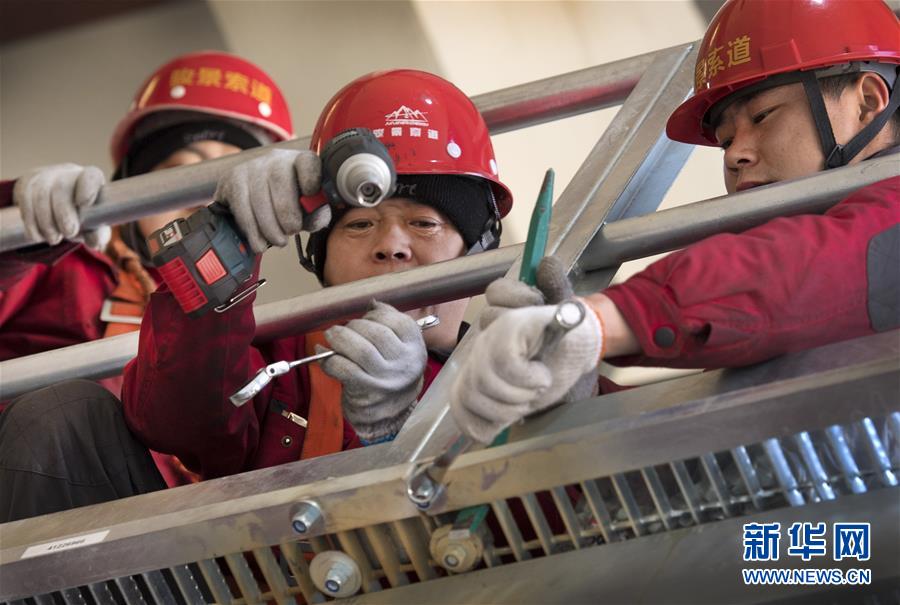 華山太華索道檢修人員在進行走臺螺栓緊固(12月5日攝)。新華社記者陶明攝