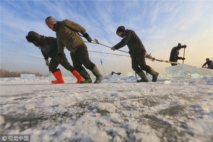 2018年12月11日,黑龍江省哈爾濱市,松花江上,采冰者們彎腰拉繩,宛如纖夫般拽重達(dá)半噸的冰塊出水。采冰者都是自哈市江北萬寶、東發(fā)、沙陀子等鄉(xiāng)鎮(zhèn)的農(nóng)民,他們每年冬閑時都會親屬、村鄰之間結(jié)伴到松花江畔采冰,有的采冰人,已經(jīng)連續(xù)干了二十多年。每個采冰季,他們每天要在冰面上工作10-12個小時,每個采冰組,一天要拽出冰塊2000-3000塊,一個近20天的采冰季,每人能收入近萬元。視覺中國