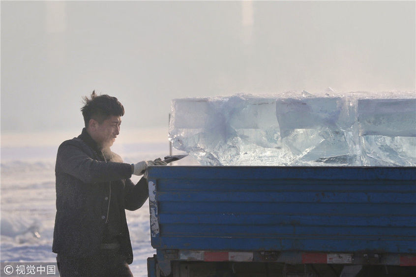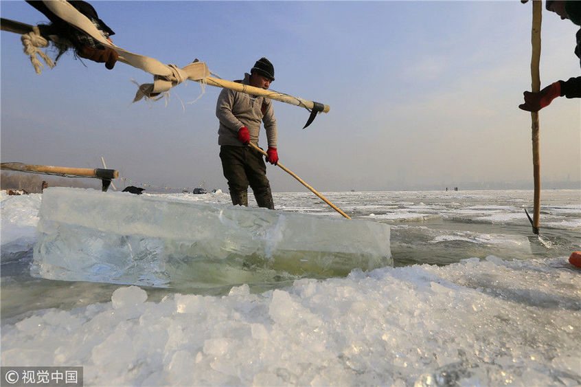 2018年12月8日,最低氣溫零下22度,哈爾濱市江北公路大橋東側(cè)的江面上,工人們正在從江中撈取冰塊,裝車運(yùn)往景區(qū)制作冰燈、冰雕?,F(xiàn)場,工人先是用電鋸、鐵釬將冰分割成半米多寬,一米多長的冰塊,接著將其拉出水面。等候在旁的叉車上前,將冰裝上運(yùn)冰的卡車,之后裝滿冰塊的卡車駛往景區(qū)。