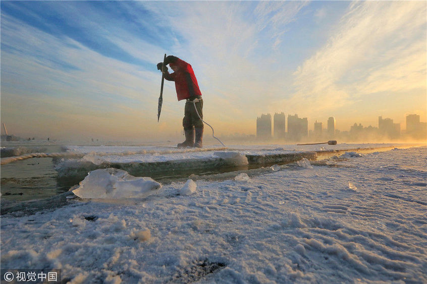 2018年12月11日,黑龍江省哈爾濱市,松花江上,采冰者們彎腰拉繩,宛如纖夫般拽重達(dá)半噸的冰塊出水。采冰者都是自哈市江北萬寶、東發(fā)、沙陀子等鄉(xiāng)鎮(zhèn)的農(nóng)民,他們每年冬閑時(shí)都會(huì)親屬、村鄰之間結(jié)伴到松花江畔采冰,有的采冰人,已經(jīng)連續(xù)干了二十多年。每個(gè)采冰季,他們每天要在冰面上工作10-12個(gè)小時(shí),每個(gè)采冰組,一天要拽出冰塊2000-3000塊,一個(gè)近20天的采冰季,每人能收入近萬元。