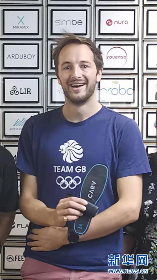 來自英國(guó)的創(chuàng)客杰米·索爾特展示自己研發(fā)的智能滑雪鞋墊(資料照片)。 新華社發(fā)