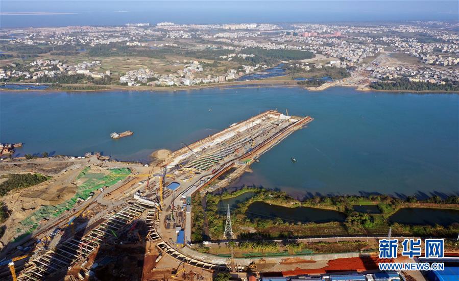 正在施工的海口文明東越江通道項目(12月14日無人機拍攝)。 新華社記者 郭程 攝