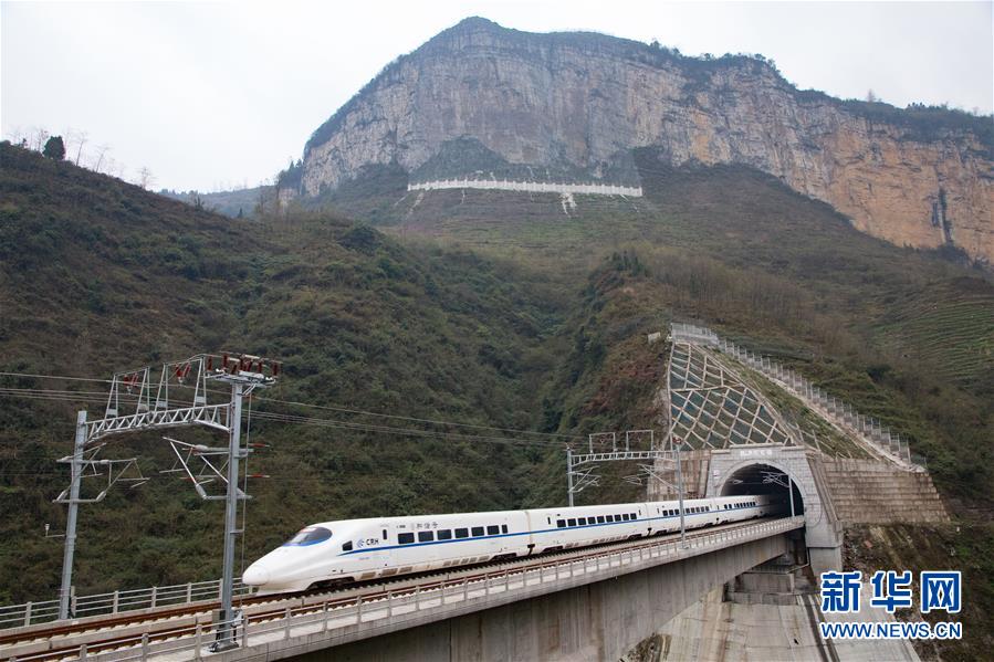 一輛成貴高鐵測(cè)試列車(chē)在山間行駛(12月3日無(wú)人機(jī)拍攝)。新華社記者劉續(xù)攝