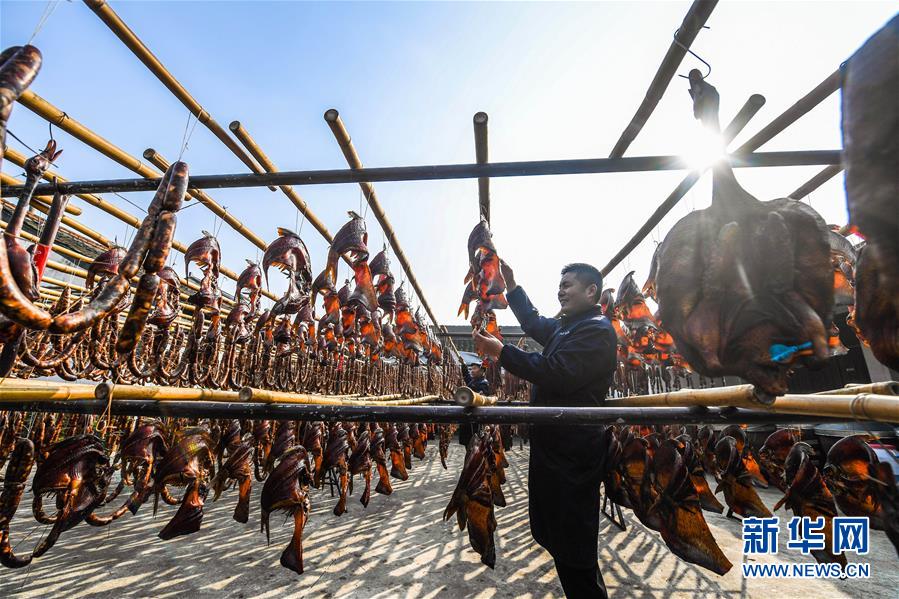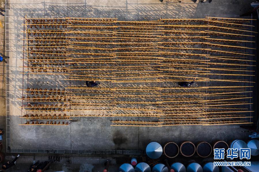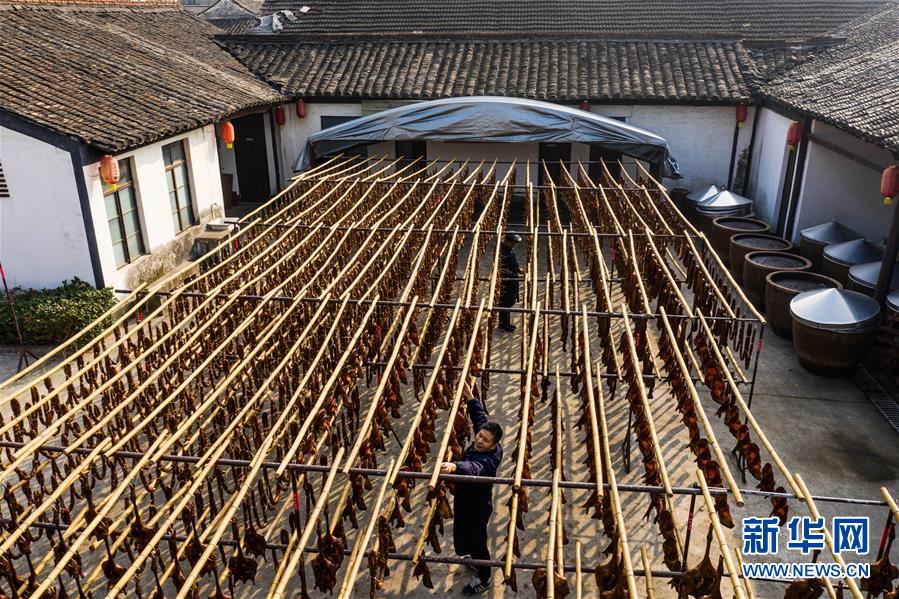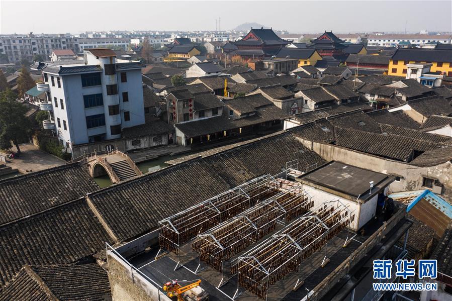 初冬時節(jié),浙江省紹興市柯橋區(qū)安昌古鎮(zhèn)開啟了傳統(tǒng)臘味制作、上市的季節(jié)。當地百姓用傳統(tǒng)醬油、黃酒、香料等手工腌制臘腸、醬鴨、魚干、醬鵪鶉、醬排骨等紹興特色醬貨,在冬季的陽光下進行晾曬,滿街飄香的臘味也成了這座江南古鎮(zhèn)的獨特風景。安昌古鎮(zhèn)是浙江省歷史文化名鎮(zhèn),有著一千多年歷史,比較完善地保存了古吳越地區(qū)沿襲千百年來的民俗風情。每年大雪節(jié)氣前后,安昌當地百姓按照傳統(tǒng)習俗挑選晴朗好天氣制作、晾曬傳統(tǒng)醬貨,各類醬貨顏色黑紅油亮,咸鮮適口,是當地冬季的特色傳統(tǒng)美食。新華社記者徐昱攝