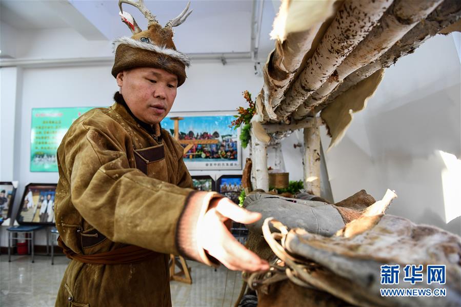 12月10日,在古里鄉(xiāng)非遺傳習所,鄂倫春族人吳曲忠在整理皮毛制品。新華社記者劉磊攝