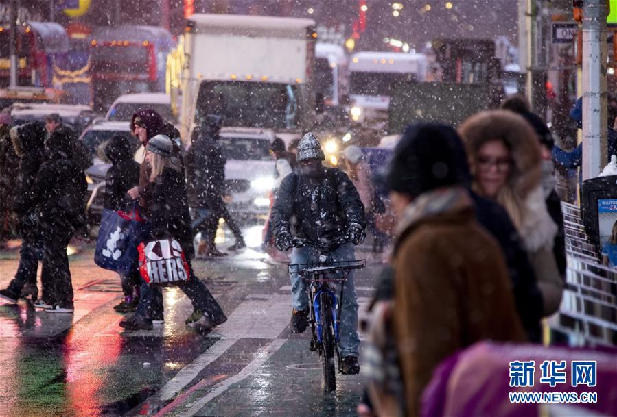 12月18日,在美國(guó)紐約時(shí)報(bào)廣場(chǎng),一名男子冒雪騎行。