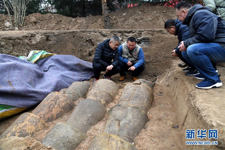 考古隊(duì)員(左二)在瑯琊臺(tái)遺址考古發(fā)掘現(xiàn)場(chǎng)介紹陶水管的構(gòu)造和結(jié)構(gòu)(12月21日攝)。新華社記者李紫恒攝