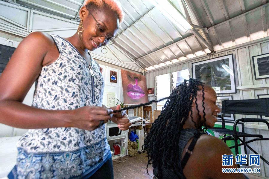 12月20日,在肯尼亞內(nèi)羅畢庫(kù)奧納藝術(shù)中心,一名藝術(shù)家為游客編辮子。 新華社記者 王騰 攝