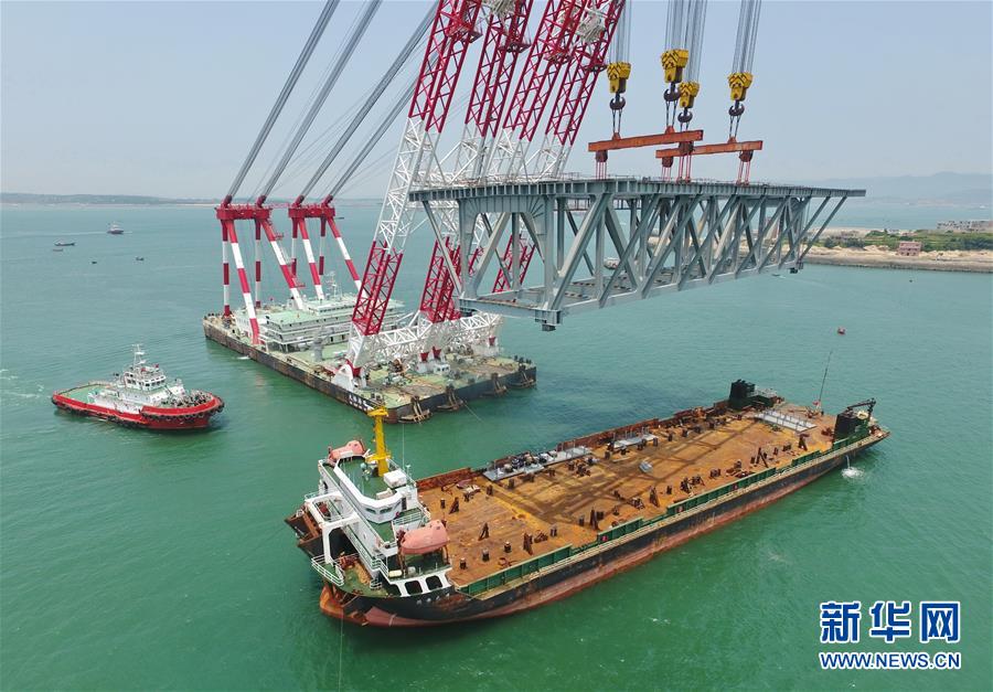 5月12日,“大橋海鷗號(hào)”起重船在吊裝一孔簡(jiǎn)支鋼桁梁(無人機(jī)拍攝)。新華社記者林善傳攝