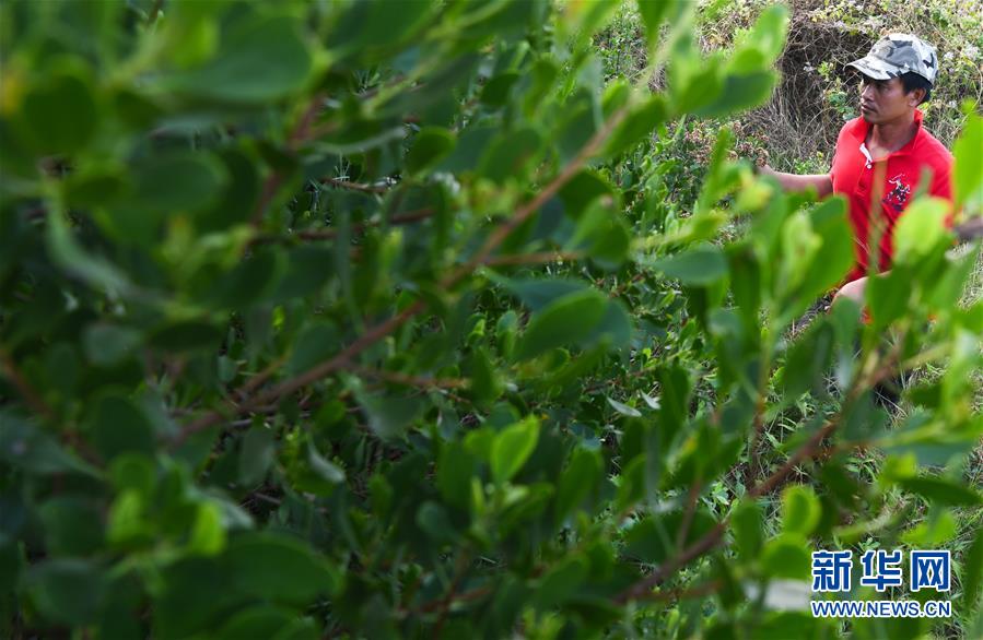 海南清瀾港省級(jí)自然保護(hù)區(qū)護(hù)林員呂詩(shī)陽(yáng)查看保護(hù)區(qū)內(nèi)的紅樹林(12月17日攝)。 新華社記者楊冠宇攝
