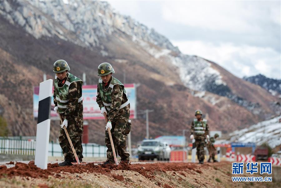 武警某部交通養(yǎng)護(hù)中隊(duì)的戰(zhàn)士在318國(guó)道八宿縣邦達(dá)鎮(zhèn)段養(yǎng)護(hù)路面(10月23日攝)。新華社記者江宏景攝