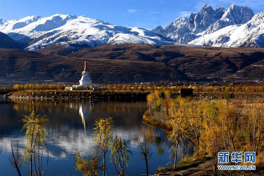 川藏線四川甘孜縣境內(nèi)的雪山、白塔和民居(11月3日攝)。新華社記者陳天湖攝