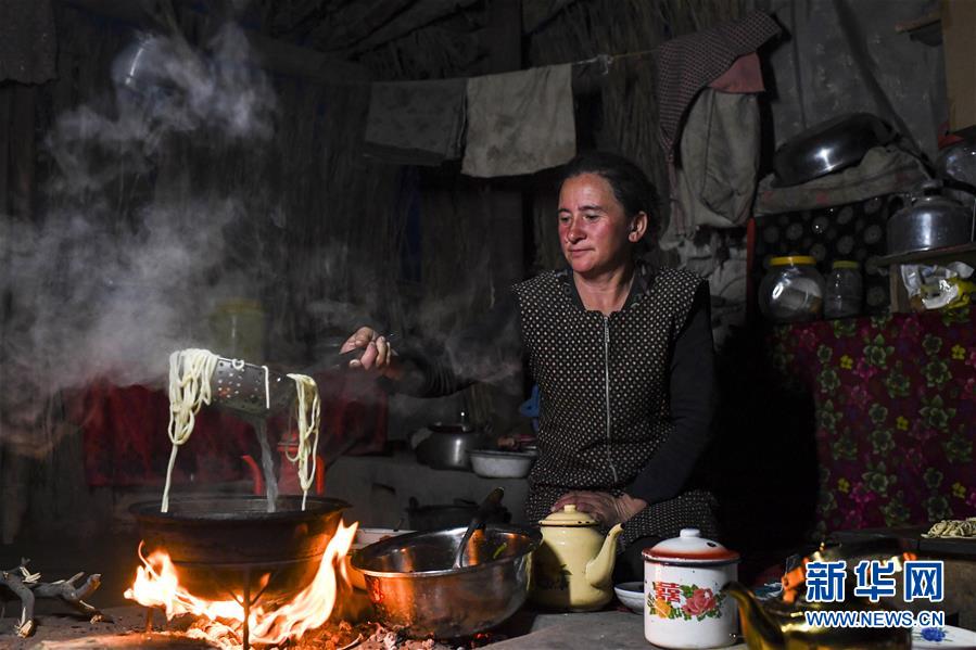 在地處塔克拉瑪干沙漠腹地的于田縣達里雅布依鄉(xiāng)5小隊,依明的妻子在夜間做拌面(3月16日攝)。新華社記者胡虎虎攝