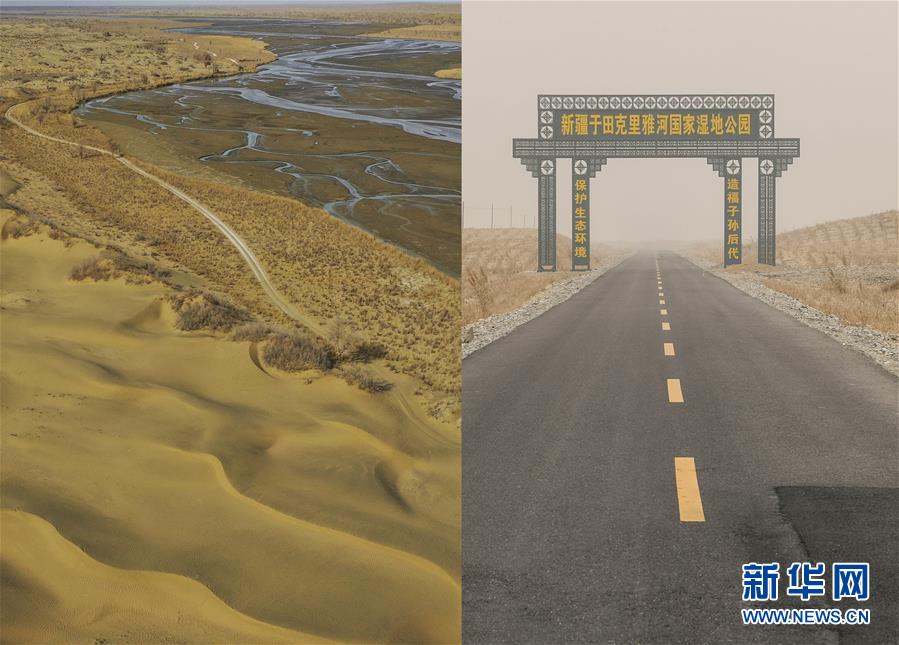 拼版照片:左圖為沿著克里雅河通向地處沙漠深處新疆于田縣達里雅布依鄉(xiāng)的路(3月19日無人機拍攝);右圖為從縣城通往達里雅布依小鎮(zhèn)易地扶貧安置點的柏油路(3月20日攝)。新華社記者胡虎虎攝