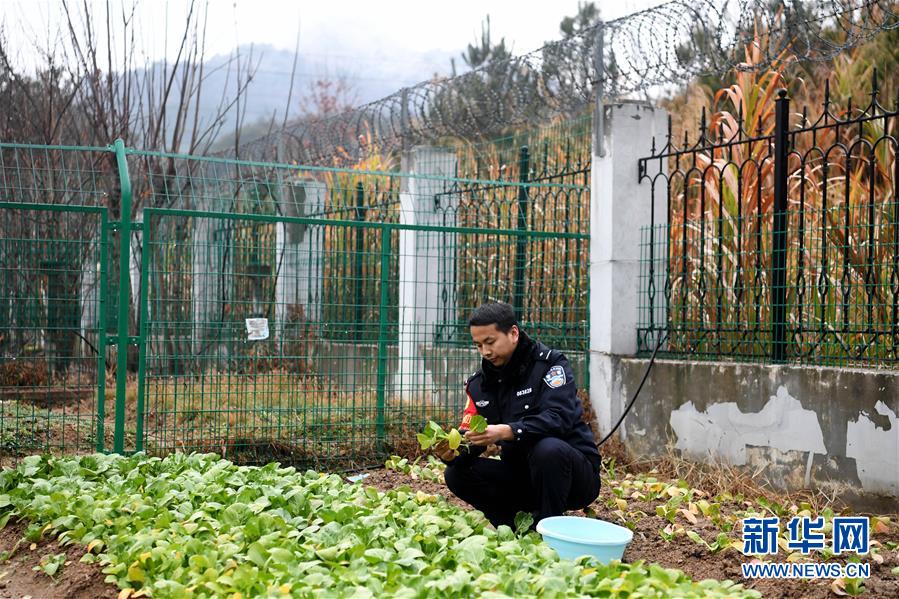 12月18日,常曉龍?jiān)诓藞@摘菜。警務(wù)室位于深山,平時(shí)買菜不方便,常曉龍?jiān)隈v地院子里開墾了一片小菜園。新華社記者劉軍喜攝