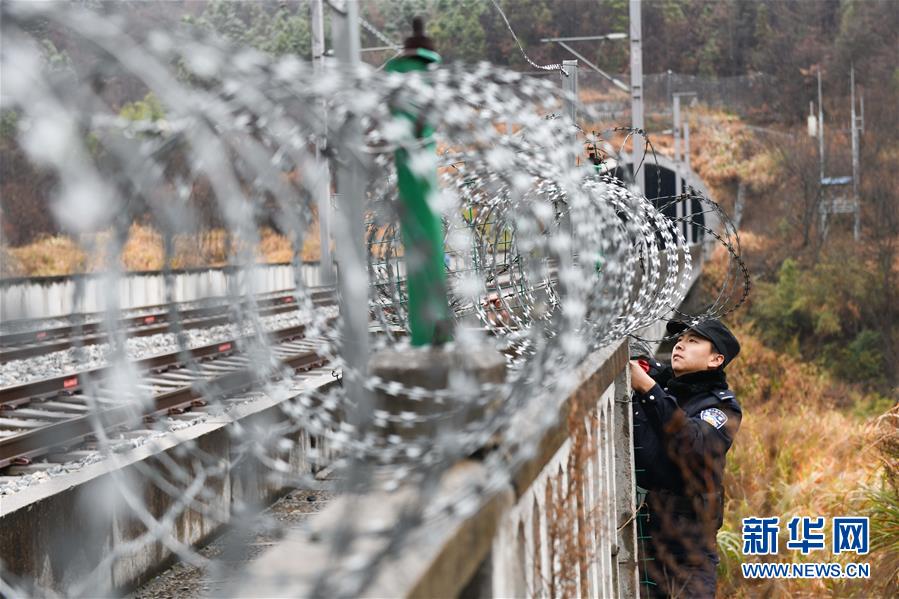 12月18日,常曉龍(左)在排查鐵路沿線護(hù)欄的安全隱患。新華社記者鄧堅(jiān)攝