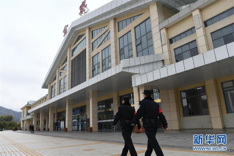 金寨火車站派出所民警何津超(左)和王晨旭在站前廣場(chǎng)執(zhí)勤(12月19日攝)。新華社記者張端攝