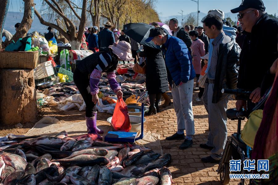 12月25日,人們?cè)谛窃坪系睦虾泳佐~市選購剛捕撈的鮮魚。新華社記者胡超攝