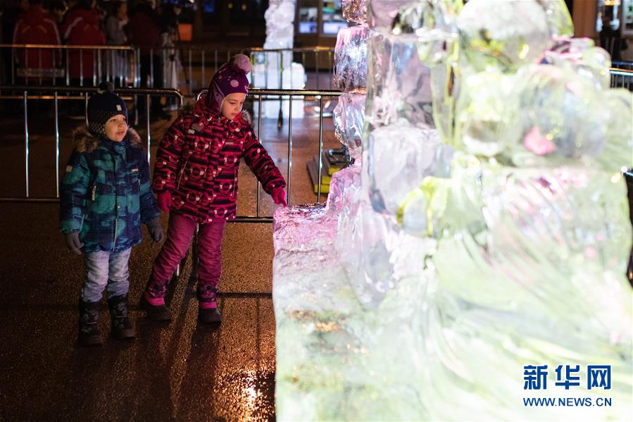 12月24日,在俄羅斯首都莫斯科,小朋友參觀冰雕藝術展。 新華社記者 白雪騏 攝