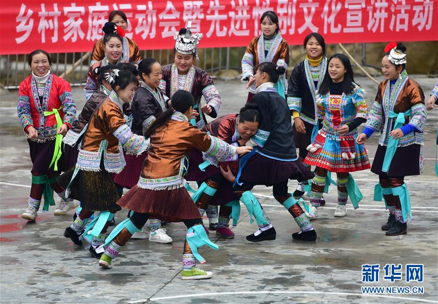 12月25日,苗族婦女參加趣味籃球比賽。 當日,廣西融水苗族自治縣桿洞鄉(xiāng)黨鳩村在柳州市婦聯(lián)支持下,在烏英苗寨舉辦家庭運動會,通過挑禾把、趣味籃球賽等活動,迎接即將到來的傳統(tǒng)苗年。 新華社記者 黃孝邦 攝
