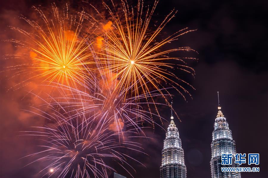 2020年1月1日,焰火在馬來西亞吉隆坡的馬來西亞國家石油公司雙塔旁綻放,迎接新年的到來。新華社記者朱煒攝