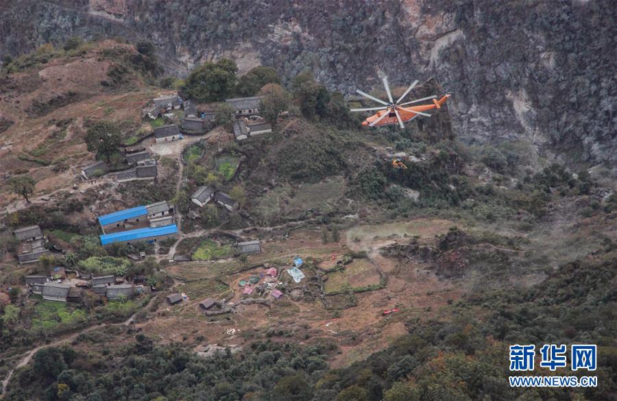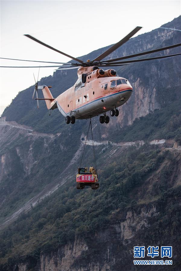 米-26重型直升機吊運一臺挖掘機飛抵阿布洛哈村上空(2019年12月5日攝)。通村公路的施工單位四川路橋租用一架米-26重型運輸直升機,克服高山峽谷、天氣多變等不利因素,從布拖縣城吊運大型施工設(shè)備到阿布洛哈村,為兩邊分頭掘進施工提供大型機械保障。新華社記者江宏景攝