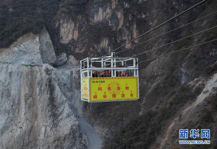 阿布洛哈擺渡車載著四川路橋的工人在峽谷兩岸運行調(diào)試(2019年12月30日攝)。新華社記者江宏景攝