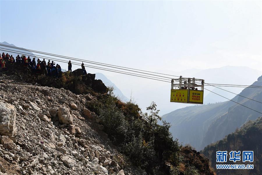四川路橋的施工人員通過臨時搭建的溜索運輸施工物資到峽谷對岸(2019年11月20日攝)。阿布洛哈村通村公路施工遇到陡崖夾溝地勢,項目進程艱難緩慢,四川路橋施工隊伍開始在峽谷兩端分頭推進。新華社記者江宏景攝