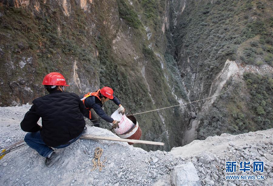 阿布洛哈村通村公路施工遇到陡崖夾溝地勢,項目進程艱難緩慢,四川路橋施工隊伍開始在峽谷兩邊分頭推進(2019年11月20日攝)。新華社記者江宏景攝