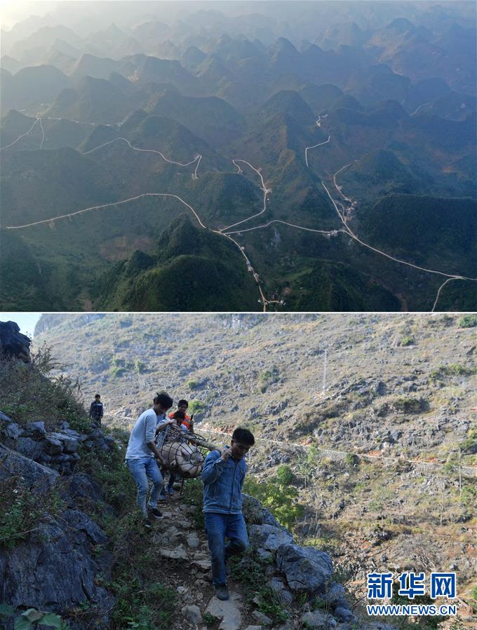 拼版照片:上圖為已經(jīng)修通水泥路的大化瑤族自治縣板升鄉(xiāng)八好村八好屯(11月11日無人機拍攝);下圖為在尚未通路的八好村八好屯,村民背著年貨走山路回家(2016年1月26日攝)。新華社記者黃孝邦攝