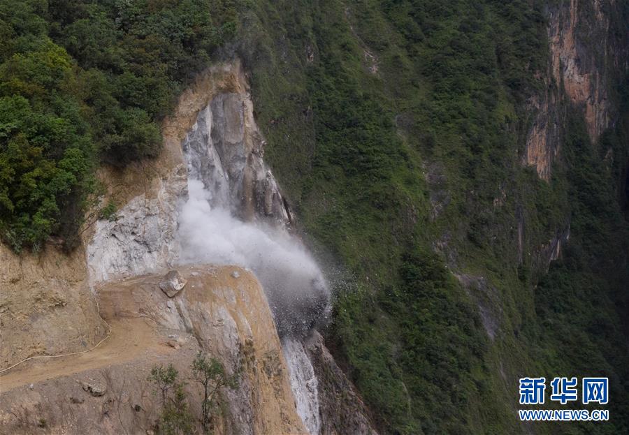阿布洛哈村通村公路施工中進行的一次爆破(2019年7月18日攝)。在該公路修建中遇到陡崖夾溝地勢時,施工人員有時一天要進行10余次爆破。新華社記者江宏景攝