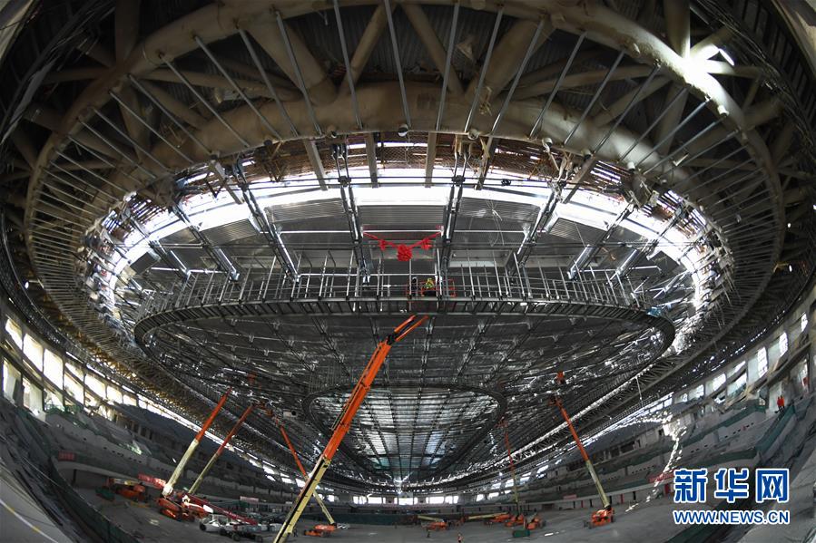 12月31日,施工人員在實現(xiàn)封頂封圍的國家速滑館施工現(xiàn)場工作。新華社記者鞠煥宗攝
